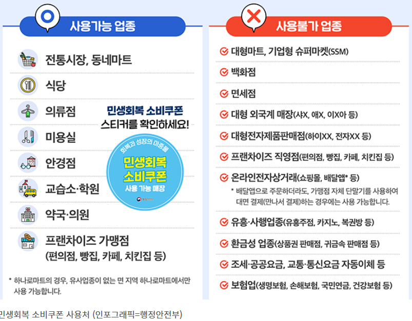 - 사용처: 관할 지자체 내 소상공인 매장, 일부 제한 업종 있음