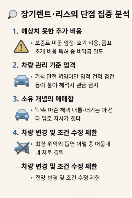 결국 ‘매달 돈을 내고 타는 것’일 뿐, 내 차로 만들지 못하면 장기적으로는 손해일 수 있음.